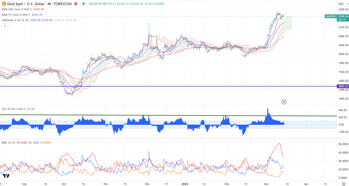 Gold showed a minor pullback ahead of US economic data. US retail sales are expected to improve to 0.80% m/m from -0.80% m/m the previous month. Retail sales, excluding autos are anticipated to surge to 0.50% MoM in Feb from -0.60% Jan. Any strong PPI will put pressure on gold at higher levels. The yellow metal hit a low of $2179 yesterday and is currently trading around $2158.32.