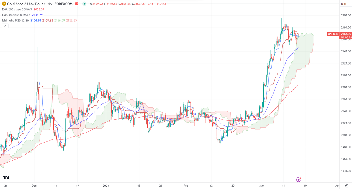 Gold pared some of its gains after strong US PPI data. The US PPI came at 0.30% Feb, slightly above the estimate of 0.20%, lower than the previous month's reading of 0.50%. The annual inflation surged to 1.6% vs. the Estimate of 1.1%. US retail sales came below expectations has increased the chance of delay in a rate cut by the Fed. The yellow metal hit a low of $2150 yesterday and is currently trading around $2168.83.