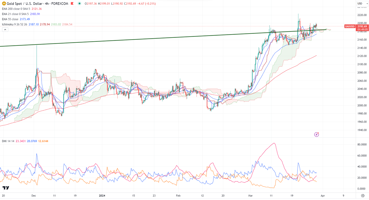 Gold has traded in a narrow range between $2157 and $2200 for the past four days. The yellow metal hit a high of $2200 yesterday and is currently trading around $2193.52.