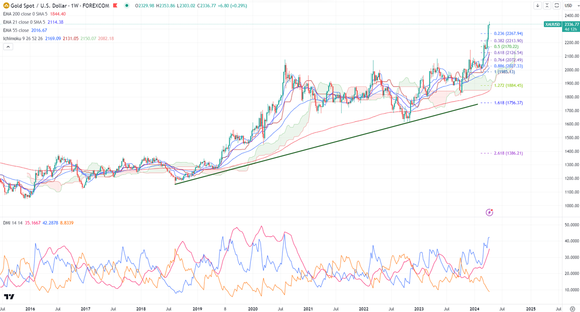 Gold gained sharply and hit a fresh all-time high on upbeat US jobs data. The yellow metal hit a low of $2353 yesterday and is currently trading around $2334.