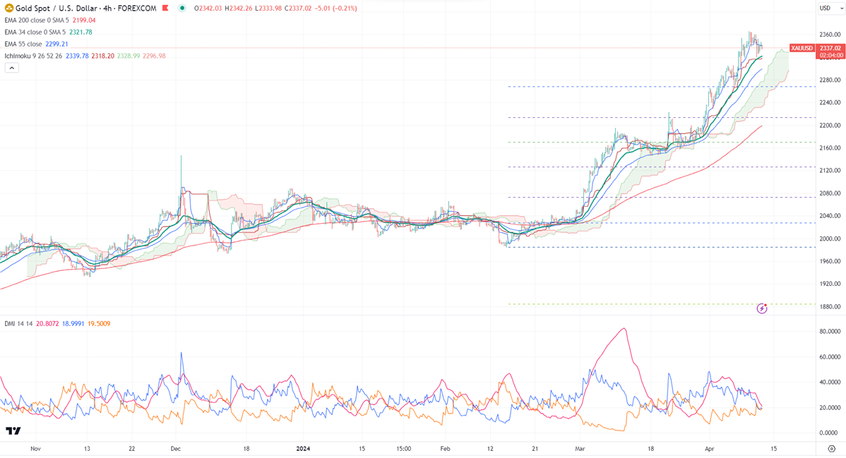 Gold pared some of its gains after the strong US inflation. The yellow metal hit a high of $2319 yesterday and is currently trading around $2336.84.