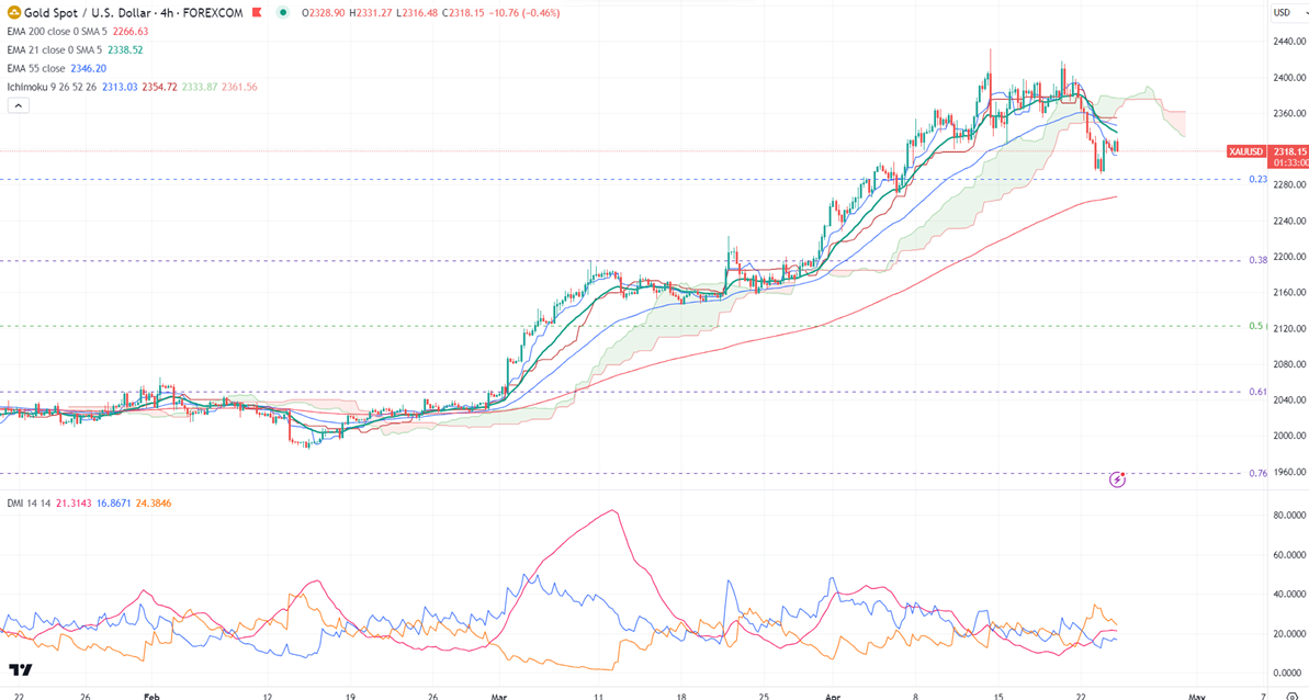 Gold showed a minor bounce from a two-week low. It hit a high of $2332 yesterday and is currently trading around $2320.86.