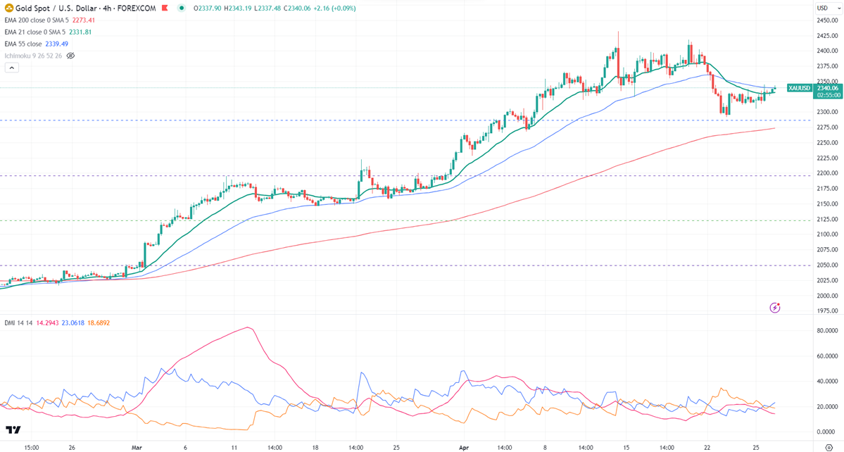 Gold showed a minor pullback on dismal US GDP data. It hit a high of $2344 yesterday and is currently trading around $2342.41.