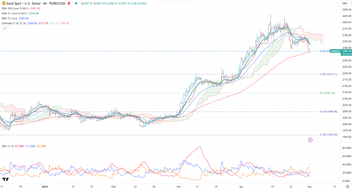 Gold lost its shine on the strong US dollar. It hit a low of $2281.74 at the time of writing and is currently trading around $2287.