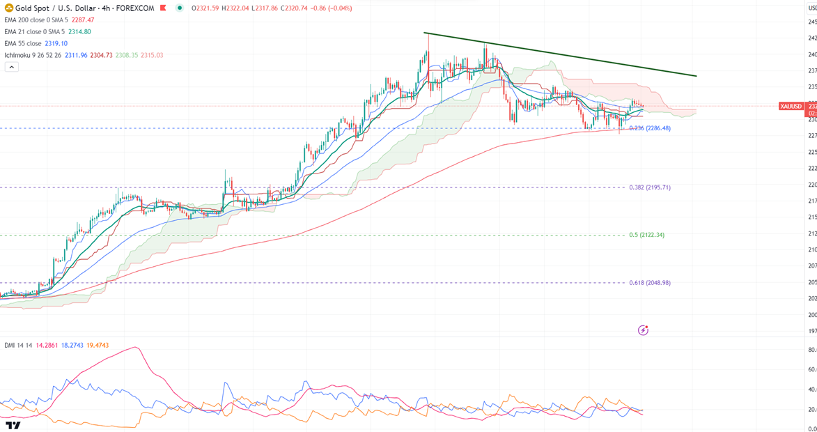 Gold gained sharply amid improved risk appetite. It hit a high of $2332 yesterday and is currently trading around $2319.75.