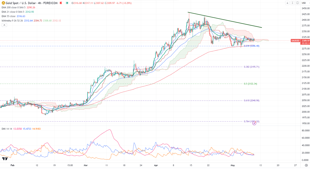 Gold is trading flat with no major fundamental factor to push prices higher. It hit a high of $2321 yesterday and is currently trading around $2310.59.