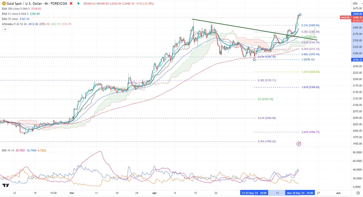 Gold surged sharply and hit an all-time high on board-based US dollar selling. It hit a high of $2450 at the time of writing and is currently trading around $2440.