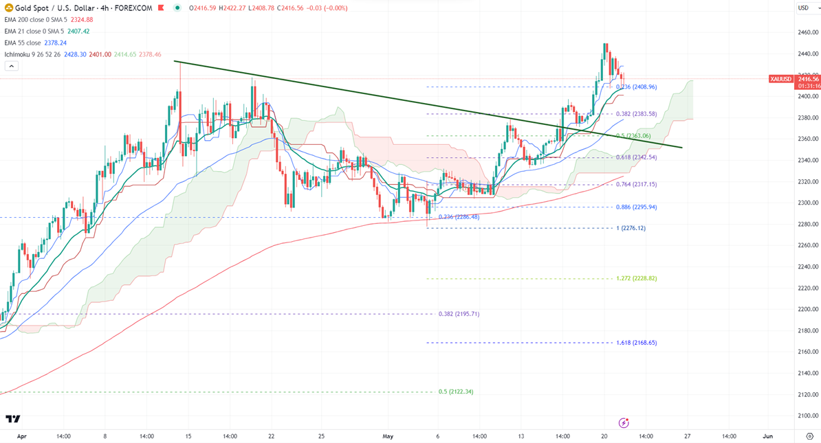 Gold pared some of its gains after hitting an all-time high of $2450. It hit a low of $2450 at the time of writing and is currently trading around $2419.