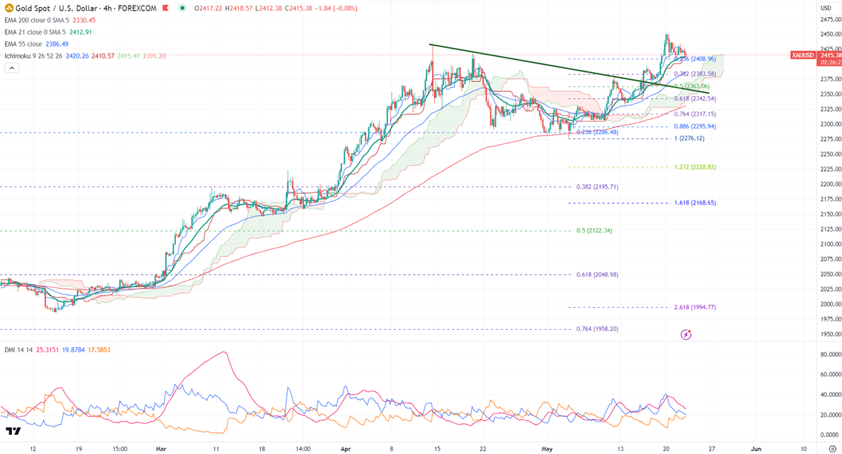 Gold is trading in a narrow range ahead of the FOMC meeting minutes. It hit a low of $2408 yesterday and is currently trading around $2416.