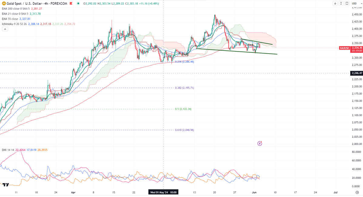 Gold showed a minor pullback on soft US ISM manufacturing PMI. It hit a high of $2351 yesterday and is currently trading around $2338.42.
