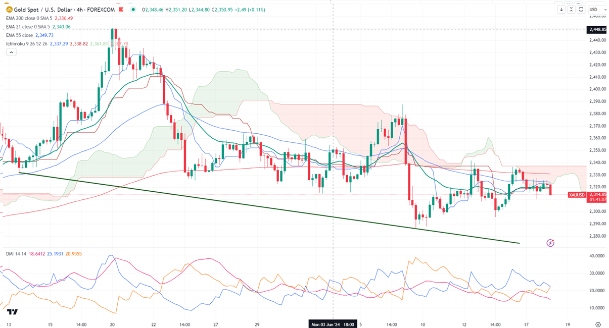 The near–term support is around $2280, a break below the target of $2270/$2250/$2228. The yellow metal faces minor resistance around $2320 and a breach above will take it to the next level of $2340/$2350/$2375.