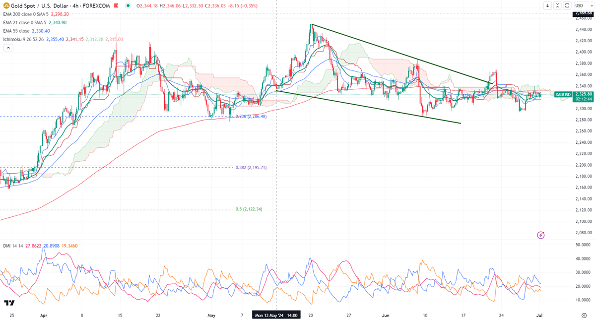 Gold trades weak despite easing US inflation. It hit a high of $2339.45 yesterday and is currently trading around $2325.35.