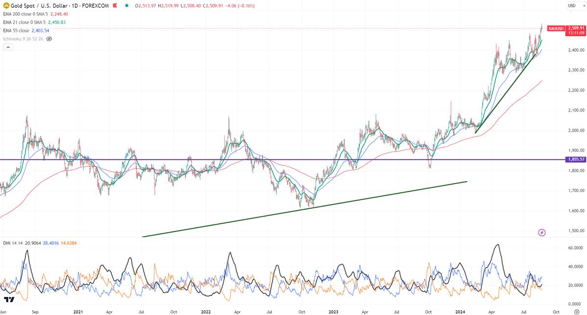 Gold hits a fresh all-time high as demand for safe-haven assets increases. It hit a high of $2531 and is currently trading around $2513.