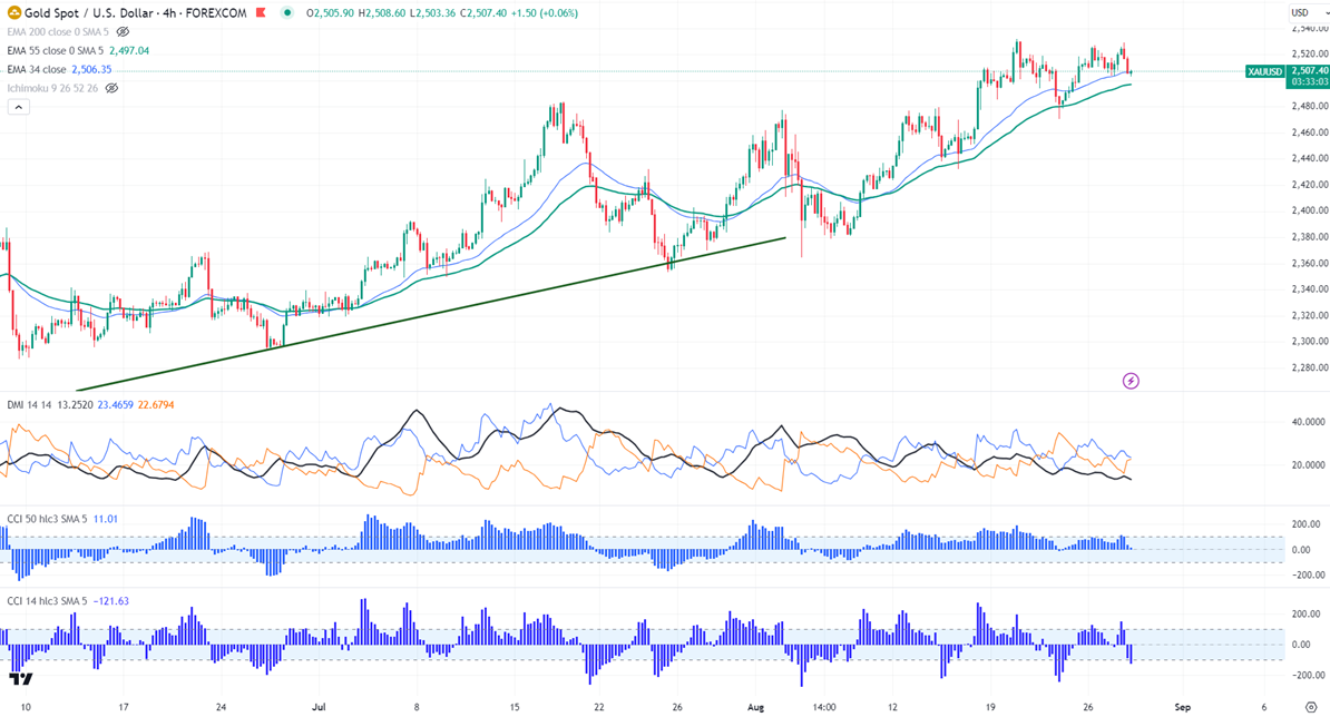The near–term support is around $2496 (55 -4H EMA), a break below the target of $2470/$2430/$2400. The yellow metal faces minor resistance around $2525 and a breach above will take it to the next level of $2535/$2554.