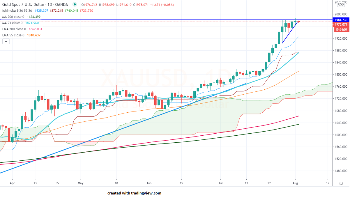 Gold is trading flat after hitting an all-time high of $1986. The upbeat US ISM manufacturing has pushed the U.S dollar index slightly higher to 93.99. The US ISM manufacturing index came at 54.2% in Jul compared to a forecast of 53.6. The US real yield on US treasuries hits record low -1.02% from 0.08% in Jan. Gold and US real yields are inversely proportional and this confirms that yellow metal to cross $200 level soon.