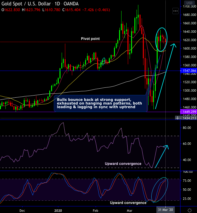 Technically, XAUUSD (Gold) price chart forms back-to-back hanging man patterns at peaks of rallies 0f $1,627 and $1,622 levels (refer oval shaped area in the daily chart). Thereby, the minor uptrend has appeared to be exhausted upon these bearish patterns.