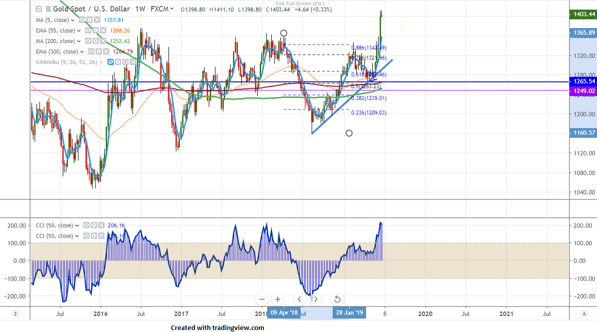 Gold was one of the best-performing assets in the previous week and jumped more than $60 from close of $1341.05. The major events fed monetary policy. The ECB President Draghi speech and escalation of tension in the Middle East have supported the yellow metal prices. It hits high of $1411 and is currently trading around $1404.43.