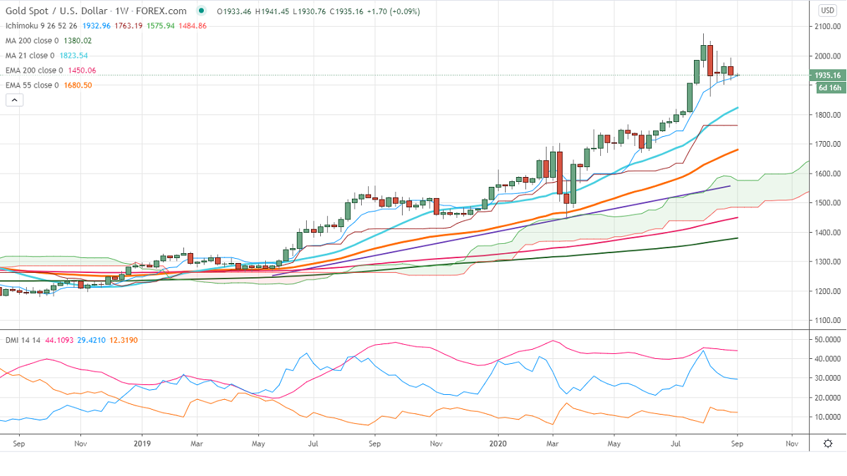 The gold is trading slightly weak for the past one week after forming a minor top around $2015. The US dollar recovered after upbeat US jobs data. The US economy has added 1371K jobs in Aug compared to an estimate of 1375K and the unemployment rate beats the street estimate at 8.4% vs 9.8%. The average hourly earnings rose 0.4% MoM and 4.7% over the last twelve months. It hits a low of $1916 previous week and is currently trading around $1935.57.
