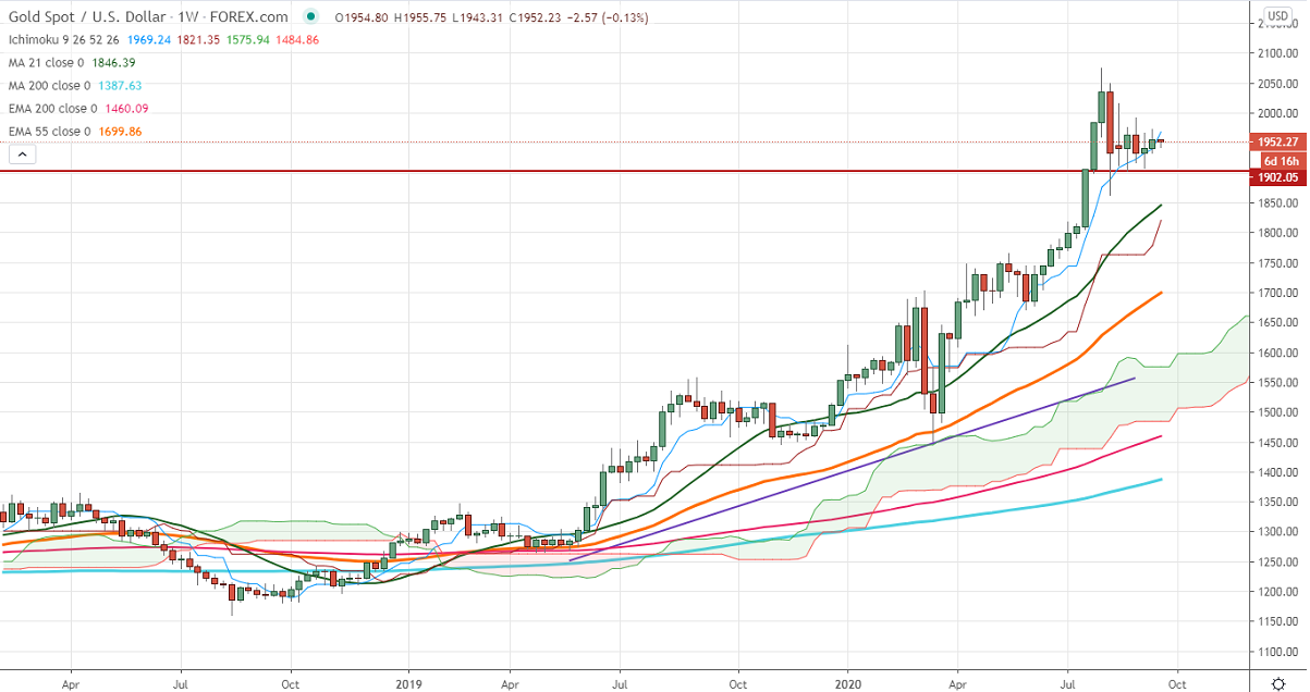 The gold is trading in a narrow range between $1973 and $1932 for the past one week. The slight weakness in the US dollar index is supporting prices at lower levels The US fed confirms in monetary poly meeting that interest rates until at least the end of 2023. The US retail sales came at 0.7% slightly less than the forecast of 1.%. The number of people who filed for unemployment benefits declined by 33000 to 86000 in the week ended Sep 12th. The housing starts and building permits came much weak than the estimate. US dollar index continues to trade weak and any violation below 92.70 will drag till 92.40/91.50. It hits an intraday high of $1955 and is currently trading around $1952.53.