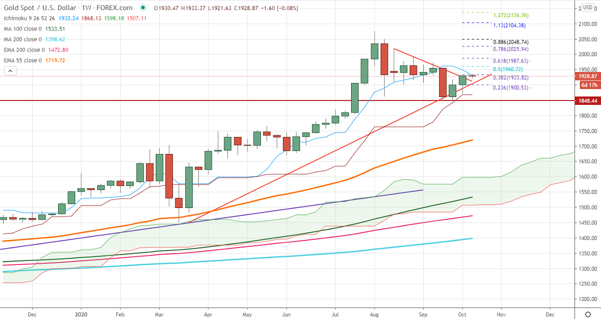 Gold was trading higher previous week on a significant sell-off in the US dollar. The upbeat market sentiment due to hopes of US fresh stimulus is putting pressure on the US dollar. The global stock market has shown a strong rebound, especially and S&P500 to retest all time 3588. The Fed minutes meeting clearly stated that there will not any interest rates hike until full employment reached. The yellow metal hits an intraday high of $1930 and is currently trading around $1929.35.