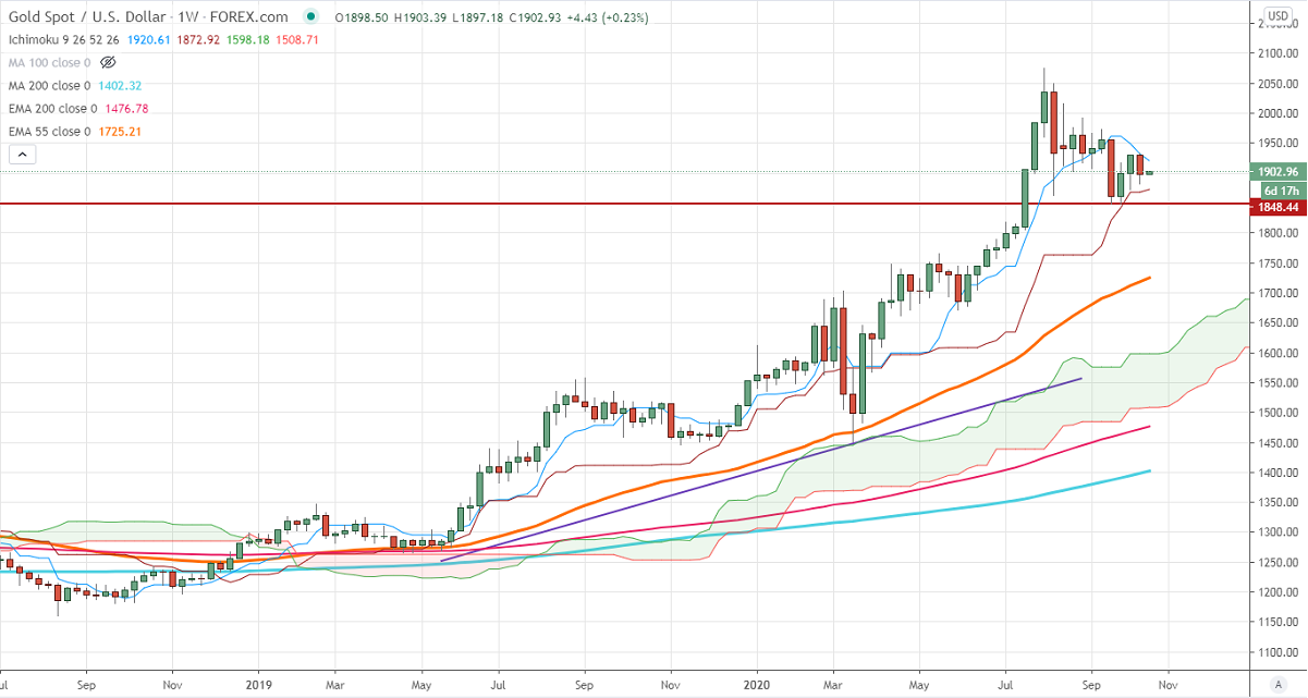 Gold is trading in a narrow range between $1872 and $1933 for the past two weeks. The US dollar gained sharply as hopes of US fiscal stimulus fades and the rise in coronavirus cases. DXY climbed sharply more than 75 pips on better than expected US economic data. Any violation above 94 confirms bullish continuation.