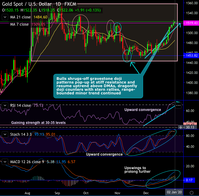 Gravestone doji, Hanging man & Bearish engulfing patterns were traced out at the stiff resistance ($1,519.43) of Gold’s price (XAUUSD). These bearish patterns halted the rallies from the last 2-3 months, and delayed multi-years highs, while dragonfly doji occurred at $1,456 levels that counters with the stern rallies and resumes the uptrend above DMAs, thereby, consequently, the range-bounded minor trend has continued. (refer daily chart). The minor trend has been oscillating between range lows of $1445.51 and range highs of $1,556.88 levels. But for now, as the bulls seem to be breaking out the stiff resistance coupled with bullish MACD crossover, we could expect robust uptrend.