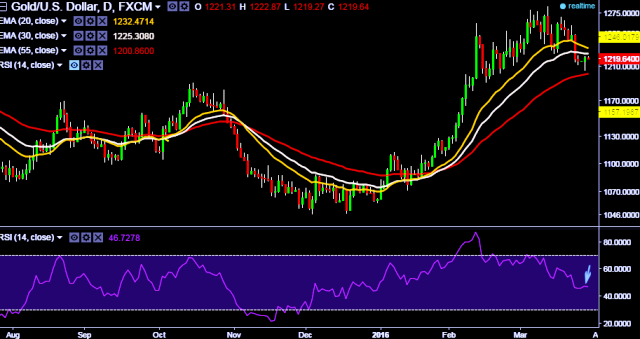We prefer to take long position in XAU/USD around $1215, stop loss $1207 and target $1222/ $1232 marks.