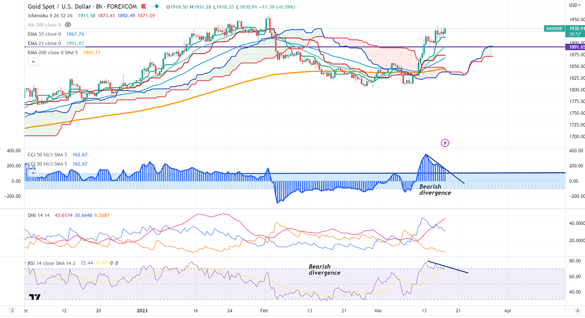 Gold prices showed a minor decline after ECB monetary policy. The European Central bank has hiked rates by 50 basis points and said that it is ready to support banks if needed. Gold hit a high of $1933.54 and is currently trading around $1928.61.