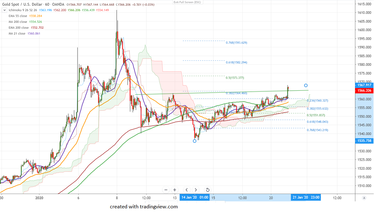 Gold is trading slightly higher after hitting a low of $1535 on declining bond yield. The yellow metal was one of the worst performers this year after hitting a 6-year high on increasing demand for riskier assets. Global stock markets have halted its winning streak after a massive rally especially S&P futures have lost more than 0.5% on account of profit booking. Gold has broken minor trend line resistance after a long consolidation. It is currently trading around $1565.78.