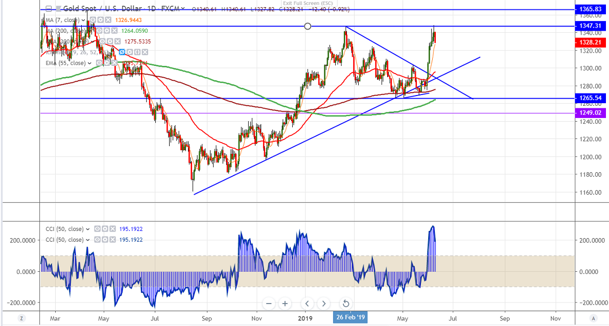 Gold has once again declined after hitting high of $1348 on easing trade tension and rising global stock market. US economy has added 75000 in May compared forecast of 180000 and wage growth at 0.2% compared to 0.2%.