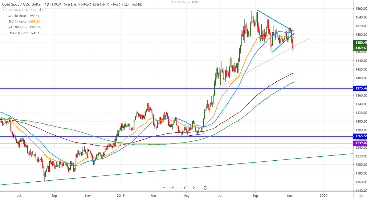 Gold has declined sharply on US-China trade optimism and rising US bond yield. US dollar index is trading higher for 3rd consecutive days and jumped more than 100 pips. Any break above 98.31 (50-day MA) confirms further jump till 99. The US and China have agreed to roll back some tariffs which are putting pressure on safe-haven assets like yen, gold. US initial jobless claims declined by 8000 to 211000 compared to a forecast of 215000. The yellow metal hits low of $1460.48 and is currently trading around $1470.28.