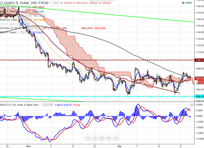 Gold has recovered till $1081 from the low of $1046 and is currently trading around $1072. Short trend is still weak as long as resistance $1100 holds.
