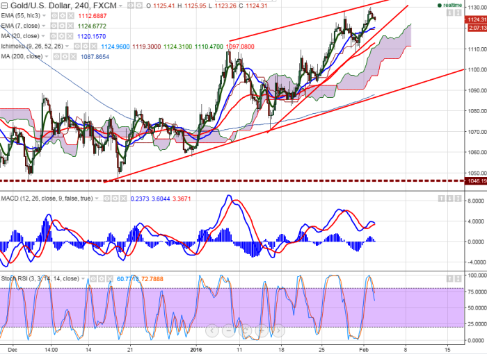 - Gold has declined till $1108 after making a high of $1130 (200 day MA). It is currently trading around $1124.