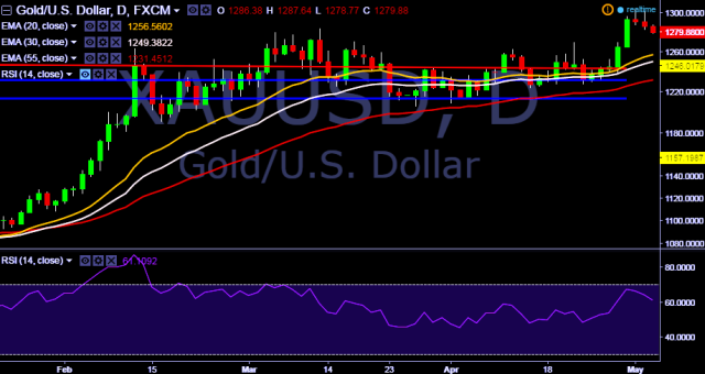 We prefer to take long position in XAU/USD only above $1282, stop loss $1277 and target $1296/$1303 marks.