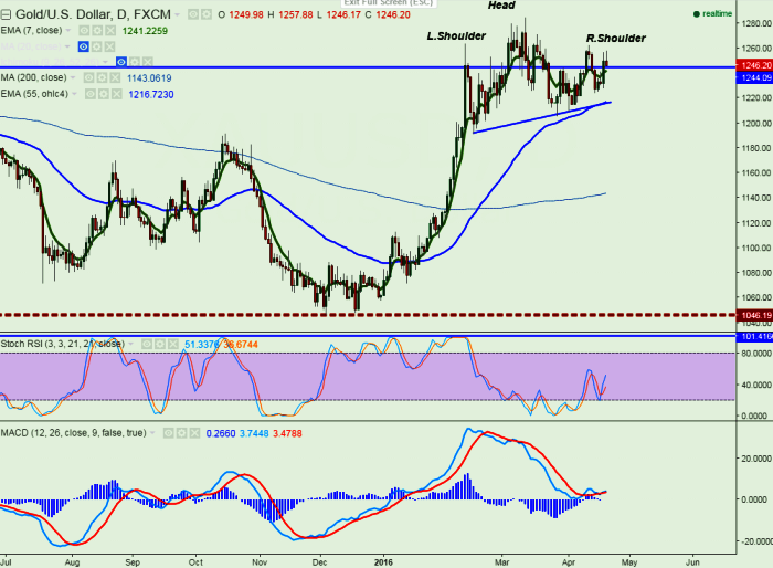 - Gold has formed clear Head and Shoulder pattern with Head at year high around $1284.40 with left shoulder around $1263 and right shoulder around same level $1262.60.