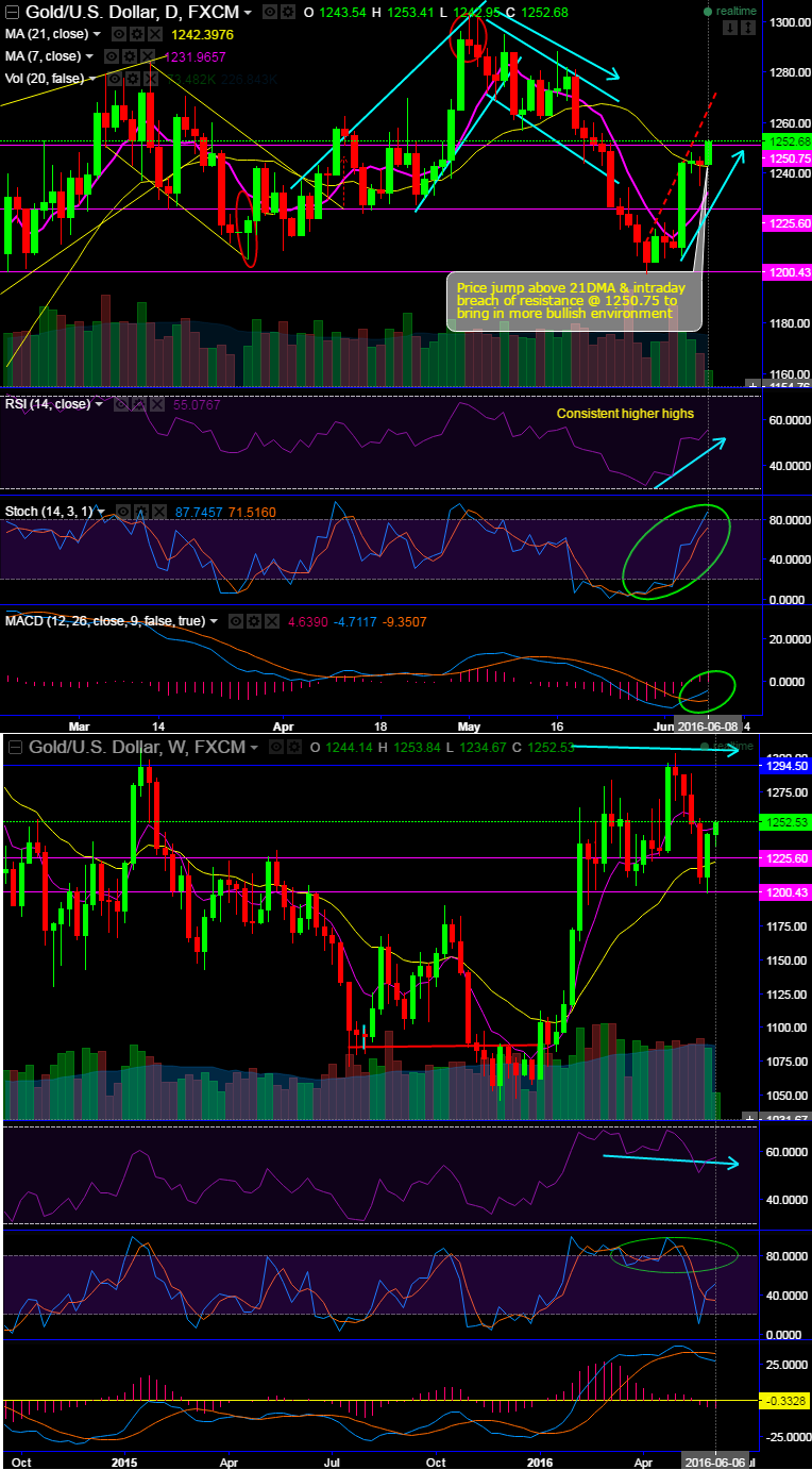 The current price jump above 21DMA & intraday breach of resistance at 1250.75 is likely to bring in a more bullish environment.