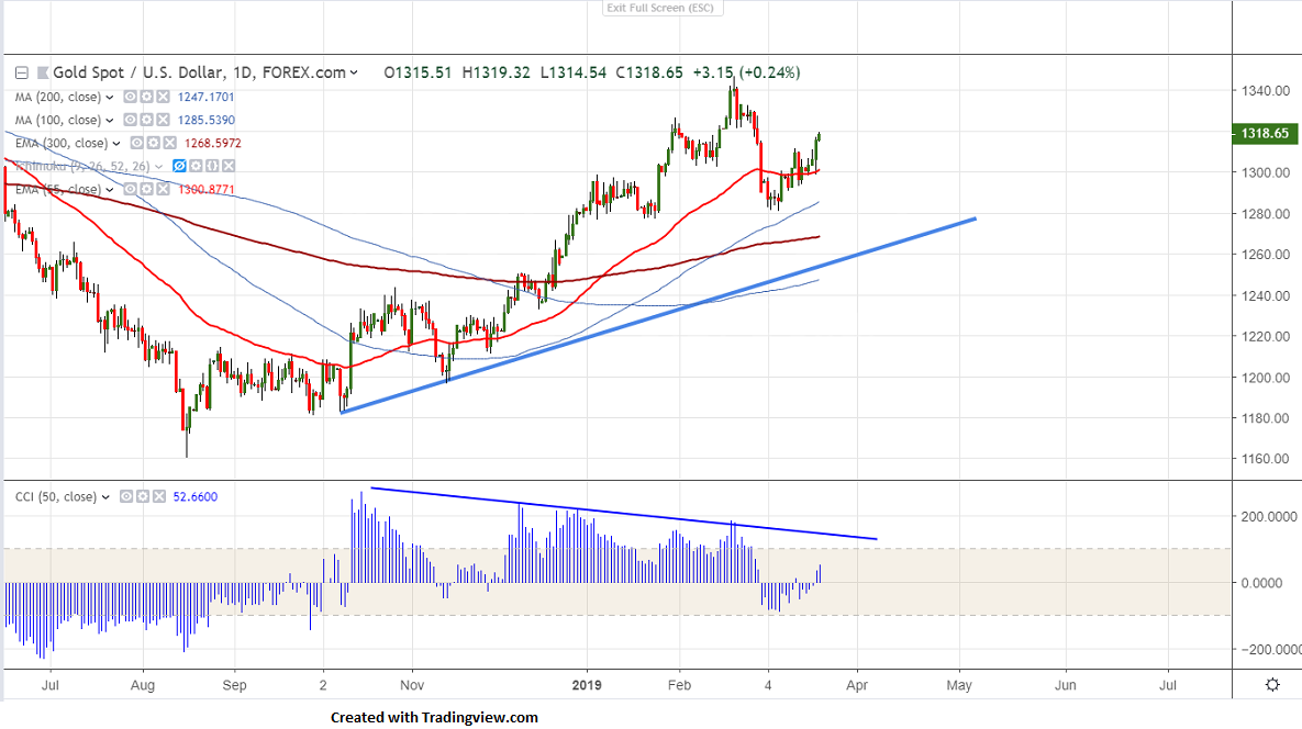Gold trades higher and jumped more than $15 after Fed policy meeting. Fed has kept its rates unchanged at 2.25-2.50 and downgraded growth forecast for 2019 from 2.3% to 2.1% and 1.9% in 2020. The Central bank dot plot confirms that there will not be any rate hike in 2019. It hits intraday high of $1318.99 and is currently trading around $1318.48. Gold was one the best performer in Jan and has jumped more than $50 on account of dovish Fed and global uncertainty.