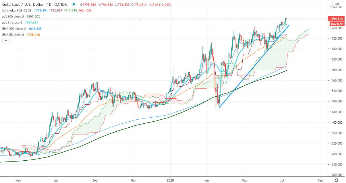 Gold surged more than $20 yesterday and hits the highest level since Nov 2011. It is one of the best performers this year and rose more than 15% on Safe-haven demand. The total of coronavirus cases is nearing 3 million in the USA and new cases yesterday jumped by 46329. The lockdown in Australian second-largest city Melbourne is supporting gold prices.