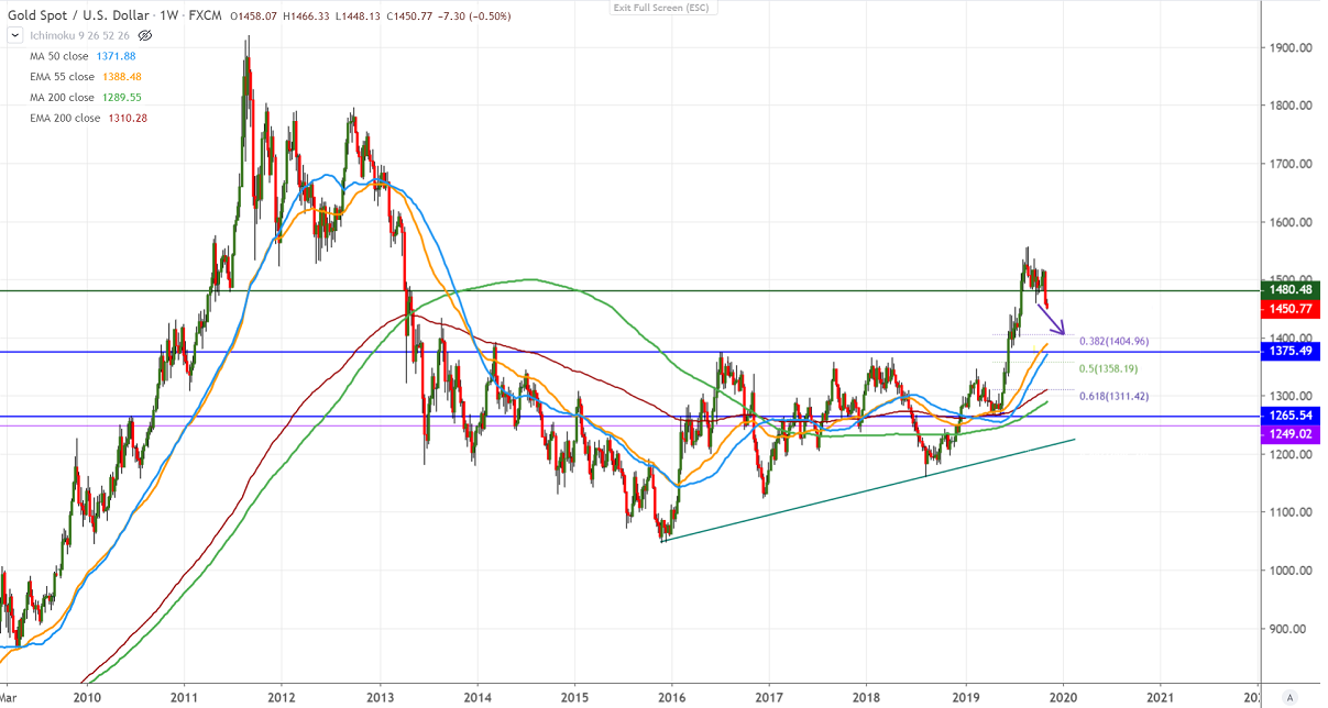 Gold continues to trade lower and hits a fresh 3-month low at $1448 on strong US dollar and rising bond yield. DXY has formed a minor bottom around 97, any break above 98.40 confirms further bullishness. Markets eye US-China trade talk progress for further direction. It is currently trading around $1450.