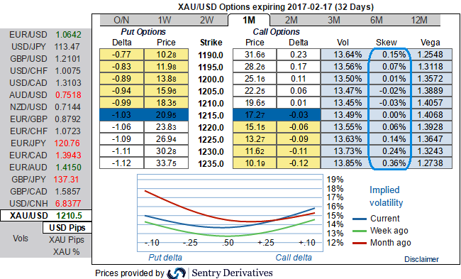 The current implied volatility of XAU/USD ATM 1w contracts are at 13% with skews signifying hedgers interests are in well balanced on either sides but slightly biased towards OTM call strikes, and it is likely to spike higher for 1m tenors.