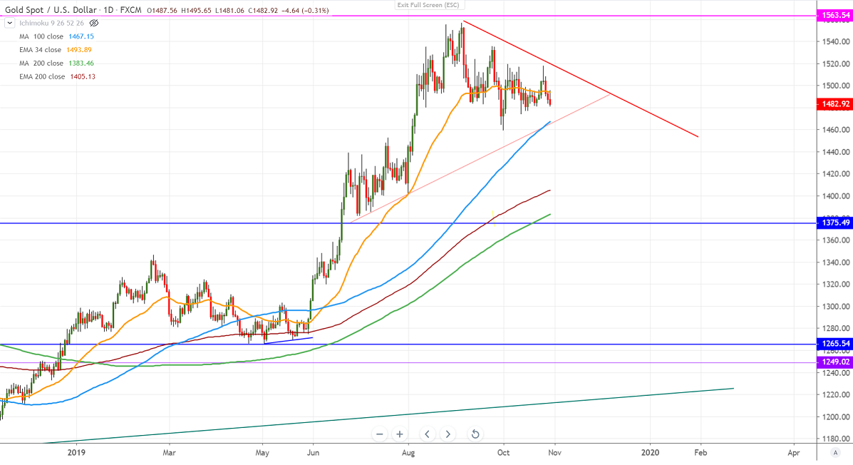 Gold has declined nearly $9 after the release of Fed policy. The central bank lowers its rates by 25 bps as expected and removed the word "act as appropriate" from the statement. The FOMC members voted 8-2 unanimously for cut expect Esther George and Eric Rosengren. The Fed was optimistic about the economy and said that the labor market is strong, the unemployment rate remained low.