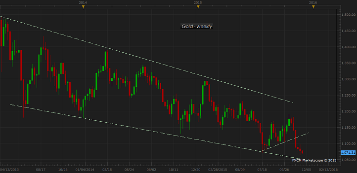 Gold has been within a downward sloping channel since April, 2013 and now trading very close to channel floor.