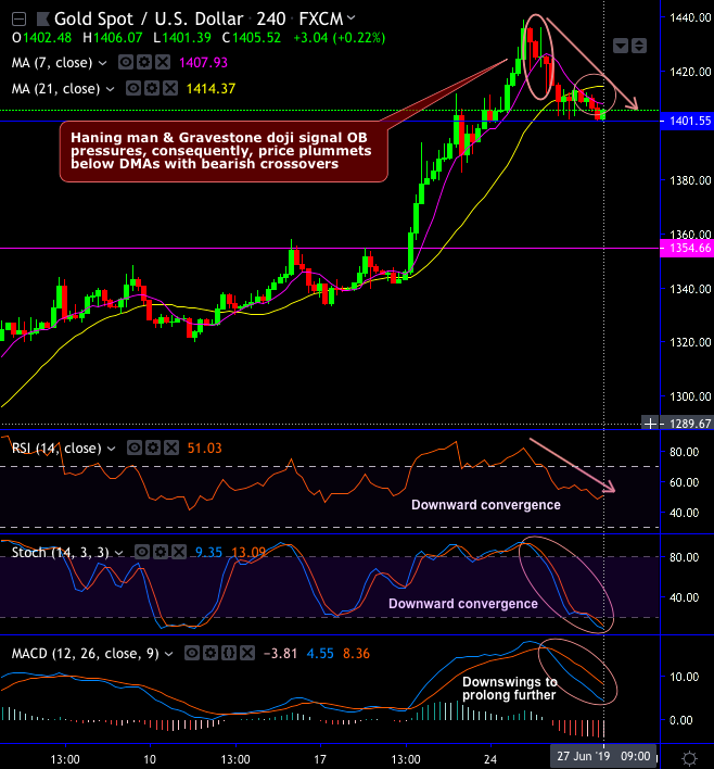 These candles are bearish nature that signal overbought pressures now, consequently, the price plummets below DMAs with bearish DMA and MACD crossovers. For now, the strong support is seen at 1401.55 levels, any breach below would drag the price dips up to 1382 levels.