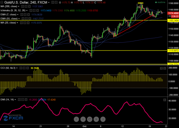 - Gold has recovered till $1180 after making a low of $1167 and is currently trading at $1174.80.