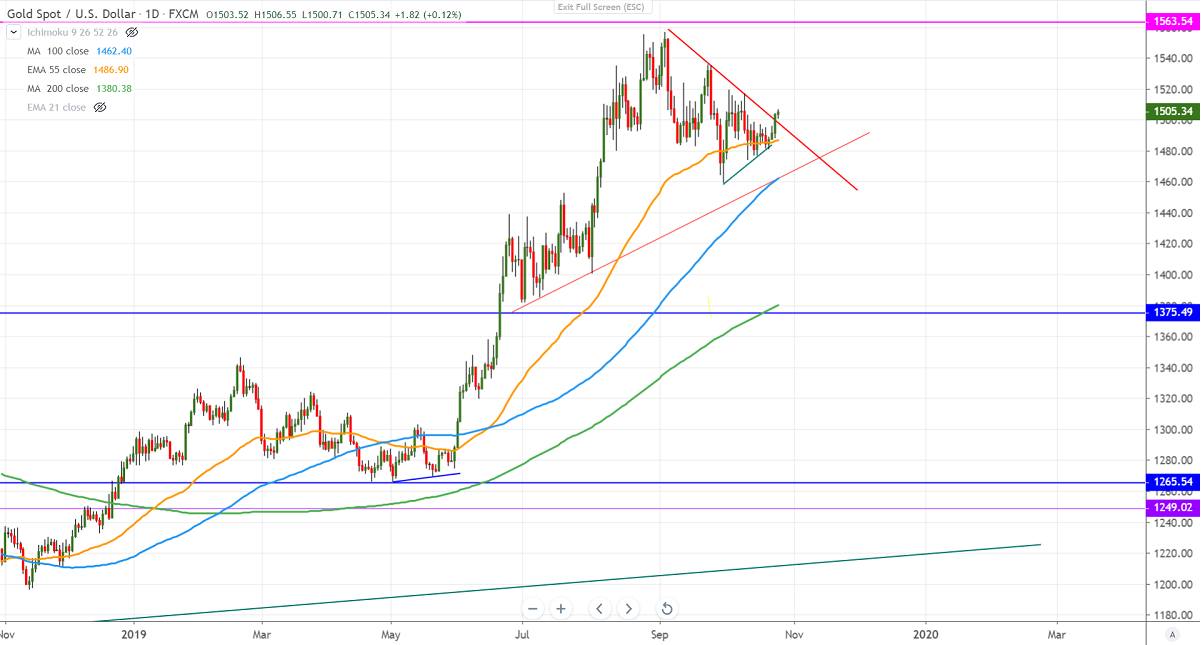 Gold recovered slightly above $1500 after weaker than expected US economic data. US durable good orders came at -1.1% in Sep compared to an estimate of -0.5% and business investment declined for 2nd consecutive month. The chance of 25bps has increased to 93.5% from 90.9% 1-week ago, according to the CME Fed watch tool.
