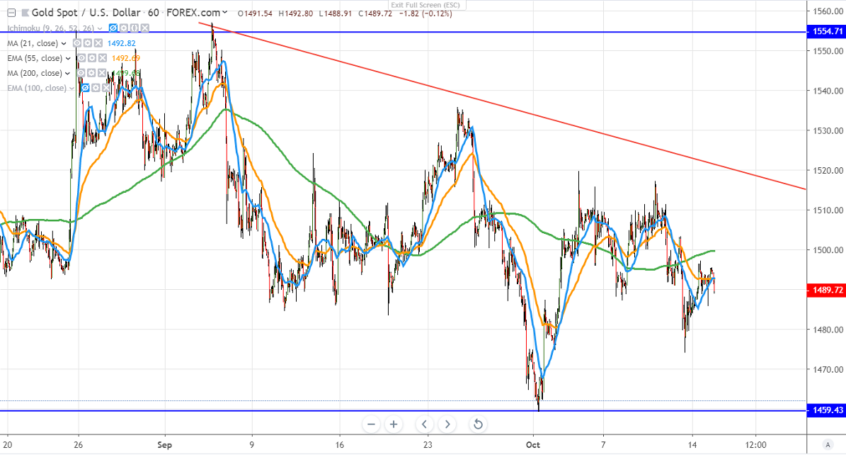 Gold has shown minor recovery of nearly $25 on decreasing hopes of the US-China trade deal. China wants another round of talks before signing a partial deal. The high-level trade talks to resume next week. The yellow metal hits a high of $1497 and is currently trading around $1491. Short term trend is weak as long as resistance $1555 holds.