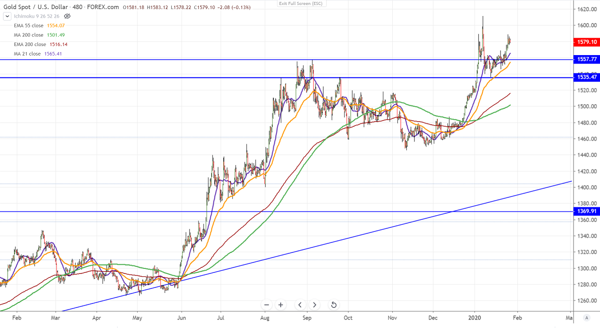 Gold is consolidating after hitting a high of $1588 yesterday. China has said that almost 106 people have died due to the coronavirus and the number of cases infected doubled to 4515 vs 2835 a day earlier.US markets tumbled sharply, especially travel-related, energy and semi-conductor shares as coronavirus spread lot of Asian countries.