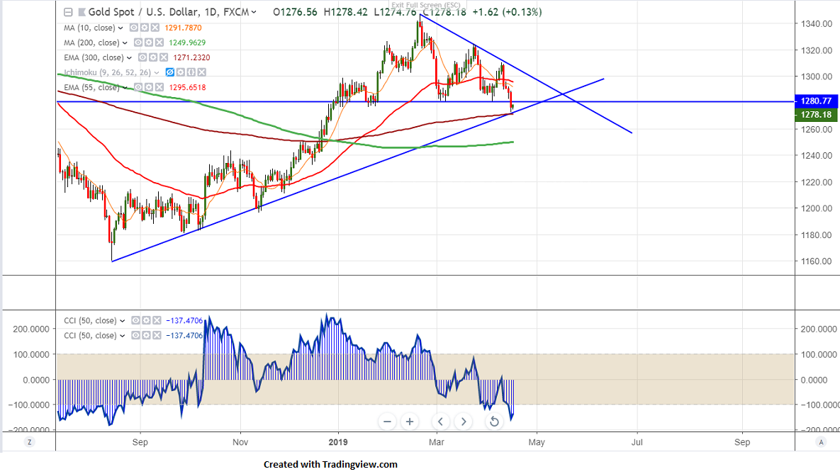 Gold has broken major support $1280 after a long consolidation for 10 trading day and hits low of $1272. It has shown a minor recovery due to slight weakness in USD.Overall sell-off was mainly due to strong global stock market on account of easing US-China trade war. US bond yield jumped more than 6% in past 5 days and this is slightly negative for yellow metal.It is currently trading around $1278.27.