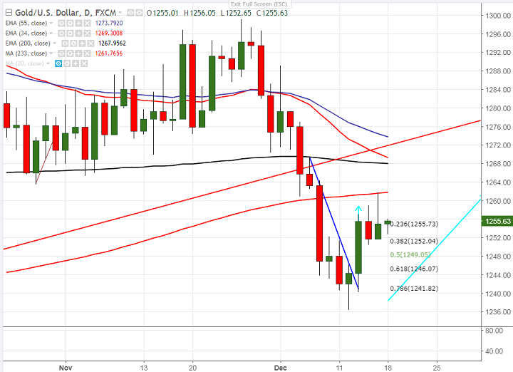 - Gold is trading flat after showing a good $25 jump in previous week on account of slightly dovish Fed.US tax bill has minor impact on US dollar as holiday week starts. The yellow metal jumped till $1261.69 and it is currently trading around $1255.54.