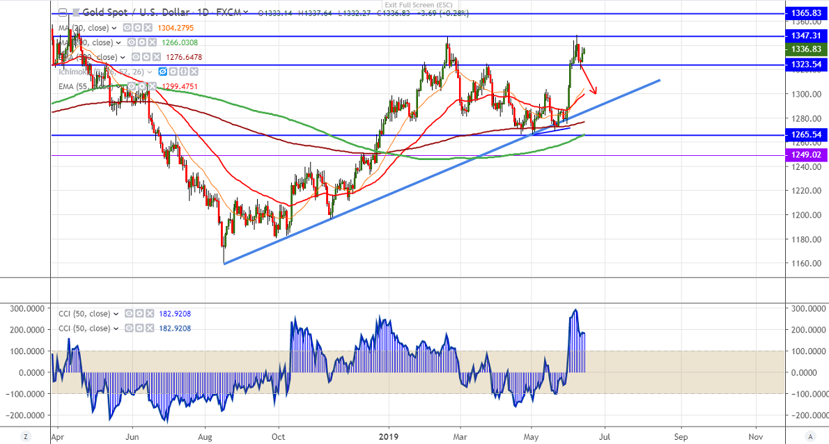 The near term support is around $1328 (10-day MA) and any break below confirms minor weakness a dip till $1320/$1309. Any major weakness only below $1300.